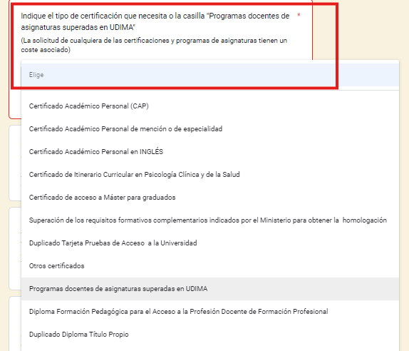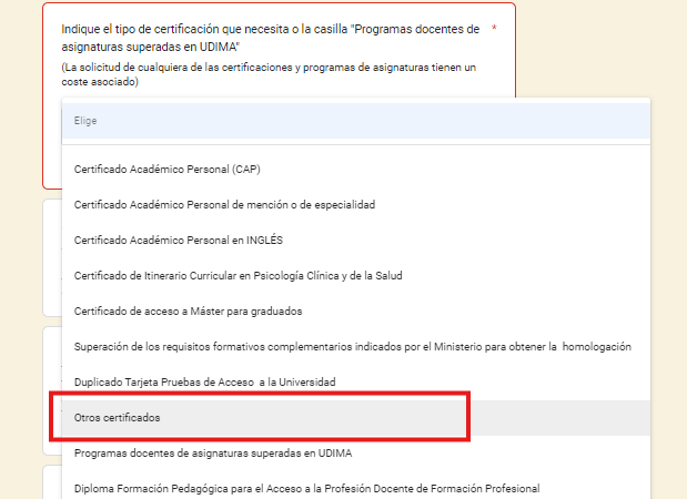 3. Selecciona el tipo de certificación. Debajo de la acción anterior, verás un menú desplegable, elige "OTROS CERTIFICADOS" para solicitar una certificación personalizada o especial.