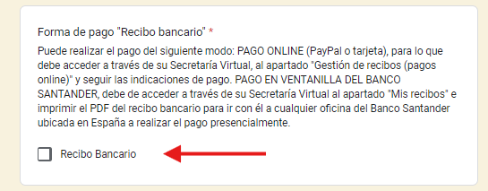 5. Selecciona el método de pago. Para confirmar tu solicitud, selecciona la opción de "Recibo Bancario". Nota: Una vez completado el formulario y enviada la solicitud, el equipo de UDIMA encargado de la gestión, enviará a correo que has usado en el formulario, el recibo por el importe a pagar y los métodos de pago Online que podrás usar.
